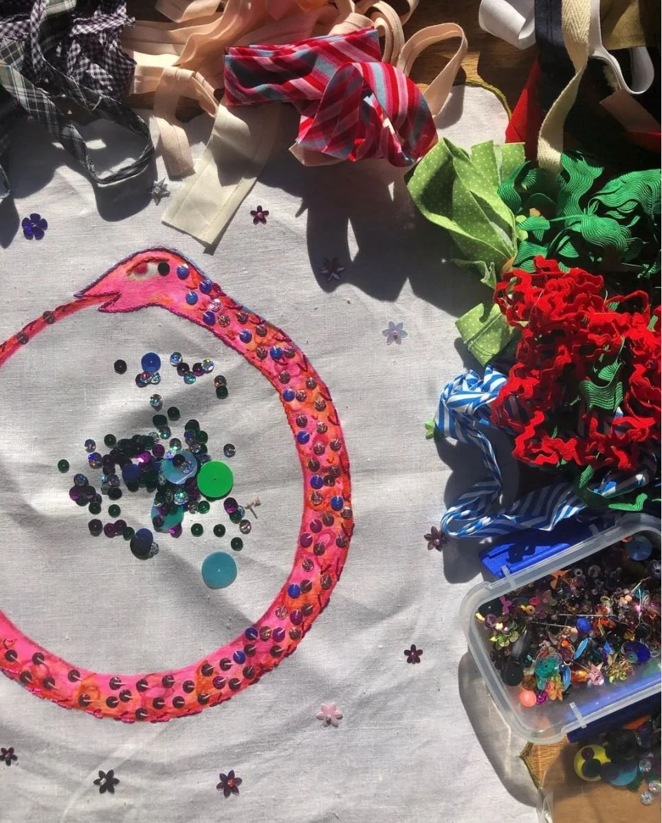 Louise Meuwissen is an Australian artist who works with textiles and found materials to make detailed embroidered paintings, sculptures and wearable art. Louise is interested in adornment and decoration, the connections between labour and luxury, and the ways we express ourselves and connect with each other through the objects we choose to collect and discard. Her practice is underpinned by her research investigating devotion, the Sublime, hoarding, storytelling and mythology.